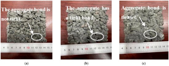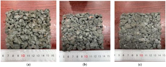 Morphology of permeable concrete specimens under different loose paving coefficients: (a) loose paving coefficient = 1.05, (b) loose paving coefficient = 1.10, and (c) loose paving coefficient = 1.15.