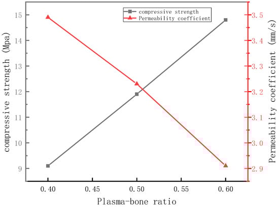 The relationship between compressive strength and the paste-to-bone ratio of permeable concrete is shown in Figure 8. When the paste-to-bone ratio was 0.4, the compressive strength of permeable concrete was 9.1 MPa and the permeability coefficient was 3.49 mm/s. The compressive strength of the specimens with a slurry-to-bone ratio of 0.5, 0.6 was 11.9 MPa and 14.8 MPa, respectively, and the permeability coefficient was 3.23 mm/s and 2.91 mm/s, respectively. Compared with the permeable concrete specimen with a slurry-to-bone ratio of 0.4, the compressive strength increased by 30.8% and 62.6 %, respectively, and the permeability coefficient decreased by 7.4% and 16.6 %, respectively. The permeable concrete specimens with different slurry-to-bone ratios are shown in Figure 9.