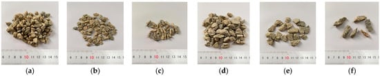 Aggregate shape classification: (a) 5–10 mm angular aggregate, (b) 5–10 mm flat aggregate, (c) 5–10 mm slender aggregate, (d) 5–10 mm angular aggregate, (e) 10–15 mm flat aggregate, and (f) 10–15 mm slender aggregate.