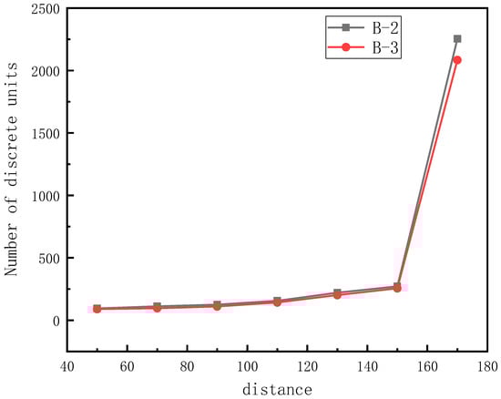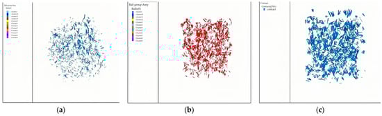 In the numerical model, the number of discrete element particles and the number of contacts between the clusters representing aggregates had an important influence on the mechanical properties of the specimen. In this study, the number of discrete element particles under different compaction degrees and the contact number between rigid clusters before replacement were calculated. The statistical results of the compressive strength of the numerical model are shown in Table 8. Among them, the number of original particles refers to the number of discrete element particles filled with cube molds before replacing the rigid clusters, and the number of aggregate particles refers to the number of discrete element particles after replacement; the ratio between them could be used to measure the relative density of different numerical models of specimens. The number of linear parallel bond contacts represented the number and size of bonds between aggregates, and the contact number of horizontal joints represented the bonding number of discrete element particles between aggregates. The contact number of the aggregate model under the three loose paving coefficients is shown in Figure 34.