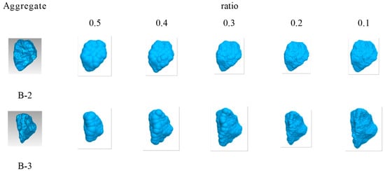 According to the size of aggregate used in the experiment, the aggregate was divided into two types: 5–10 mm particle size and 10–15 mm particle size. According to the shape of the aggregate, the aggregate was divided into three types: angular aggregate, flat aggregate, and slender aggregate. The shapes of the three aggregates are shown in Figure 10. According to the statistics of the number of aggregates of different shapes in the two kinds of aggregates, the proportion of the number of aggregates of each shape to the total number of aggregates was obtained. The shapes of 1000 aggregates of 5–10 mm and 10–15 mm size were calculated. The statistical results are shown in Table 5.