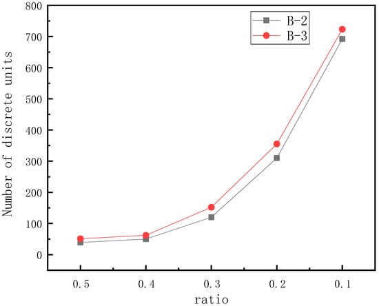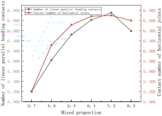 In the numerical model, the number of contacts reflected the mechanical properties of the model to some extent. In the mixed particle size aggregate, the different proportions of aggregate with a single particle size affected the density of the permeable concrete mixture and the bond quantity between aggregates, thus affecting the mechanical properties. To study the effect of different proportions of mixed aggregate on the contact quantity of the model, a numerical simulation test was carried out by selecting a 0.5 slurry-to-bone ratio, 1.10 degrees of compaction, and setting different mixing ratios. The mixing ratio and the number of contacts are shown in Figure 36.
