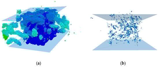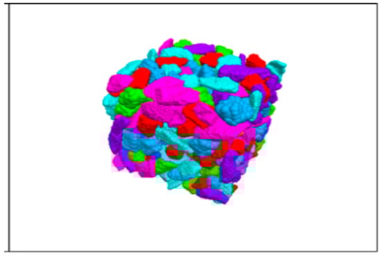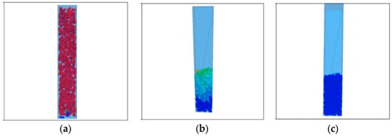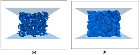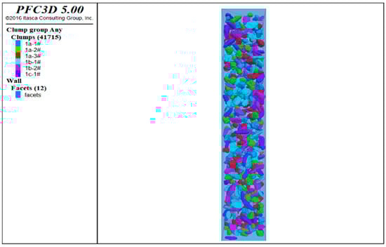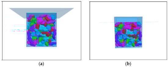 The random particle model, which uses randomly distributed circular particles to represent the aggregate, fully considers the randomness of aggregate distribution, it was first proposed by Cundall and was later developed into the present DEM [,,,]. Permeable concrete can be conceptualized as a bonded granular material, which is suitable for modeling with a discrete element model [,]. S. Sinaie [] studied the effectiveness of DEM in predicting the size effect of cylindrical concrete specimens under compression, the results showed that the DEM can effectively reproduce the effect of aspect ratio on compression performance. R. Pieralisi [] presented a large-scale test scheme considering different aggregate shapes, gradation curves, and the ratio of aggregate to cement paste to evaluate the behavior of a permeable concrete mixture in a fresh state and to verify the numerical model. The fitting results between the numerical calculation results and the experimental results show that the model and constitutive relation reproduced the uniaxial under-compaction process of concrete. Azevedo [] used DEM to simulate concrete and analyzed the two-dimensional tension−compression model. The results show that, by using the ductile tensile failure model and adding friction force to the simulation, the mechanical behavior of concrete could be simulated more accurately. TranVT [] simulated the mechanical behavior of concrete under a triaxial load using DEM. Through the analysis of the calibrated uniaxial and triaxial experimental results, it was proven that the local interaction in the model could explain the macroscopic behavior of the samples under confining pressure well. R. Pieralisi et al. [] proposed a comprehensive model that combined DEM with computational fluid dynamics (CFD). The permeability was evaluated using a numerical method, taking into account the influence of the mixture composition and compaction process. The compaction process of permeable concrete in a fresh state was simulated by DEM, and the meso-geometric structure was obtained. Based on the DEM-CFD model, extensive experimental studies on the permeability of permeable concrete were carried out, and the experimental results were used to verify the DEM-CFD model.
