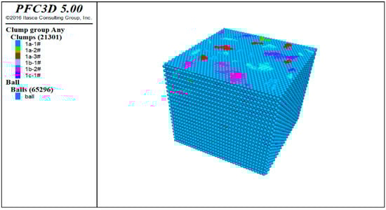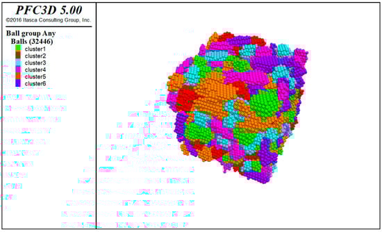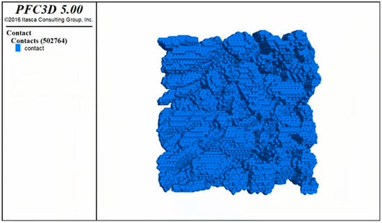 After the contact model and parameters were determined, the compressive strength was tested using the numerical model of the corresponding specimen. The restore command to call was used to generate the specimen model and to generate corresponding walls above and below the model; after that, the speed and time of pressing under the wall were given, and the stress−strain curve during the testing process was recorded using the history command. The compression test process is shown in Figure 29.