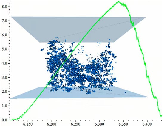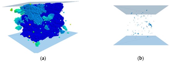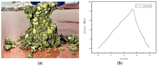 Figure shows the number and distribution of cracks after competing for the essive failure of the model; after the model was destroyed, cracks were mainly distributed at the edge of the model, and the distribution in the middle part was the densest, and the upper and lower fissures were less, the distribution of cracks were visible, the failure form of the specimen was the top cone failure and was consistent with the failure form of the specimen in Figure 28, and the peak values of the stress−strain curves were the same. This shows the effectiveness of parameter calibration; it was consistent with the failure form of the specimen after the compression test in Figure 28, and the stress−strain curves and peak values of the two were also the same, which shows the validity of parameter calibration and the reliability of the simulation.