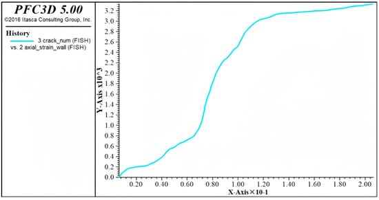 Figure 33 shows the change in the number of cracks in the numerical model during compression simulation. As can be seen from the figure, at the initial stage of the specimen compression test, the number of cracks increased rapidly, and the discrete element particles at the edge of the model peeled off. With the increase in load, the number of cracks tended to be stable, which shows that stress redistribution occurred in the specimen model at this time, the specimen model entered a relatively stable state, and the compressive capacity was enhanced. As the load continued to increase, the stress and strain of the numerical model of the specimen continued to increase, the numerical model reached the limit of the compression test, fracture occurred between the aggregates inside the specimen and the aggregate, the number of cracks increased sharply, and then the specimen was destroyed.