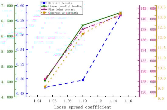 As can be seen from Figure 35, the compressive strength was positively correlated with the relative density and contact quantity; among them, the number of contacts between aggregates in the numerical model with loose paving coefficients of 1.10 and 1.15 increased by 37.04% and 60.77%, respectively, compared with the numerical model with a loose paving coefficient of 1.10, the relative density increased by 2.05% and 20.29%, respectively. This shows that the porosity of the specimen decreased with the increase in the compaction degree of the mixture. The increase in the content and contact of aggregates, led to an increase in compressive strength. The number of contacts was more suitable for measuring the mechanical properties of the numerical model.