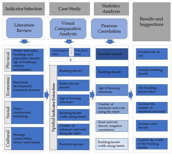 In summary, the spatial indicators were identified as road network density, building density, age of housing structures, building facade width along streets, number of entrances along streets, and function mixture (Table 1) based on relevant and related research, which is assumed to be correlated with urban grain and analyzed empirically.