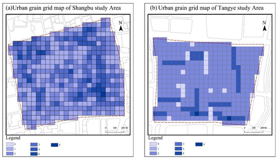 First, the results of the urban grain analysis were obtained. There were 141 parcels in the Shangbu study area, while there were only 18 parcels in the Tangye study area. The difference in the number of parcels was significant, and it could be preliminarily determined that the urban grain of the Shangbu area is finer (Figure 6). There were 153 grids with urban grain values of three or higher in the Shangbu study area, while there were only two such grids in the Tangye study area. Compared to the large number of grids with identical and low-scoring grids in the Tangye study area, there were more grids with high scores in the Shangbu area. The mean and maximum values of urban grain in the two areas were calculated separately (Table 2), and the two values were 2.2 and 6 in the Shangbu area and 1.09 and 3 in the Tangye area, which means values in the Shangbu area were almost twice as high as those in the Tangye area.