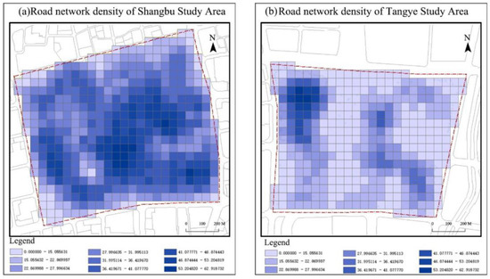 Road network density for the Shangbu study area (a) and Tangye study area (b) (source: author).