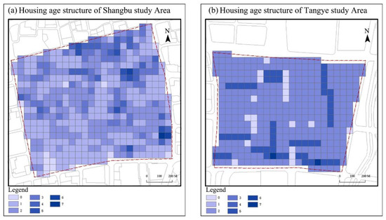 The age of housing structures represents the third spatial indicator, and the age of housing structures in the Shangbu area was more complex (Figure 9). By counting the number of grids in each age structure range (Table 4), we could see that the age structure of the Shangbu study area was much more mixed, with a maximum value of seven (i.e., there were seven buildings of different age levels in one grid). In contrast, the maximum value of the Tangye study area was only two (three cells).