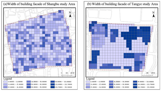 The width of the building facades along the streets represents the fourth spatial indicator, and the value of the width of the building facades along the streets in the Tangye study area was more significant (Figure 10). The values were almost all above 50, while the widths in the Shangbu study area were almost all below 50. The average values of the two areas were calculated separately (Table 5), from which it could be seen that the average value of the Shangbu study area (67.8) was almost 28 times larger than that of the Tangye area (23.5), and the minimum and maximum values also showed a considerable difference.