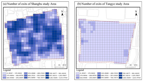 The fifth spatial indicator represents the number of entrances and exits along the streets, and the value in the Shangbu study area was higher (Figure 11). The mean and extreme values of the two areas were calculated separately (Table 6). The mean value of the Shangbu study area was almost 12.6 times higher than that of the Tangye study area, and the minimum and maximum values were very different.