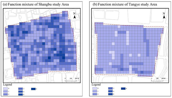 The last spatial indicator represents function mixture, and the Shangbu area had a higher function mixture (Figure 12). Furthermore, compared with many grids with smaller values along the Tangye area, there were more grids with high values in the Shangbu area (Table 7). About 69.2% of the Shangbu study area’s grids had values above 2, while the Tangye study area only accounted for 11.3% of the total.