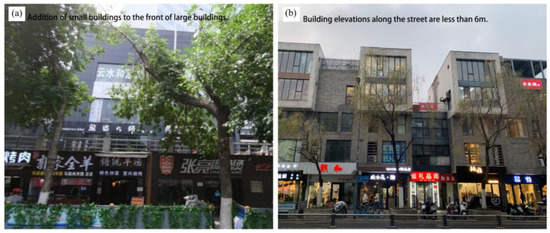 It is also possible to increase the proportion of fine grain by transforming large-scale building blocks in the following ways: Firstly, building facades could be modified by dividing them to form a narrower building facade width. The primary method to achieve this is to renovate large-scale buildings and enrich large-scale neighborhood spaces. For example, on the outside of the first floor of a large building along a street facade, arranging small buildings with less than 6 m along a street facade can lead to large-scale buildings having smaller and more vibrant spaces to achieve a fine-grained area (Figure 13). In addition, by increasing the permeability of a street through openings in the building facade, the interaction between the street and pedestrians is promoted, thus enhancing the vitality of the street [57]. For example, externalizing some cafes and small stores with unique characteristics increases their transparency on the street. In addition to facade renovation, a building can also be divided in terms of plan dimensions by adding small-scale blocks for different purposes above the roof of large-scale blocks or by adding roof-top parking. Additionally, the Open Building approach proposed by the Dutch architectural theorist Habraken helped realize the creation of fine grain in high-density cities [58], where an architect only designs and builds the supporting part’s basic structure, and the users install and perfect the infill part. This practice could allow buildings to continue to refine their functions through spontaneous growth, thus realizing the refinement of building blocks.