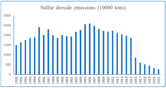 Due to the lack of fundamental changes in China’s coal-based energy structure, atmospheric pollution, mainly caused by sulfur dioxide pollution, will persist for a long time. Moreover, due to the high sulfur content in coal in some regions and the fact that most enterprises have not installed desulfurization equipment, China’s sulfur dioxide emissions have increased sharply year by year, leading to serious acid rain pollution. Figure 2 depicts the changes in sulfur dioxide emissions in China from 1990 to 2021. As shown in the figure, from 1900 to 1995, China’s sulfur dioxide emissions rapidly increased, from 14.95 million tons to 23.7 million tons. Subsequently, China’s sulfur dioxide emissions began to decline, reaching 18.57 million tons in 1999. With the continuous development of the economy and the increasing demand for coal consumption, sulfur dioxide emissions have been increasing year by year, reaching a peak of 24.68 million tons in 2006, followed by an overall downward trend. However, the total amount of sulfur dioxide emissions still ranks among the top in the world.