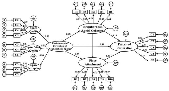 To study which factors of the neighborhood spatial environment are more conducive to the perceived restoration of left-behind older people, this study analyzed the “environmental perception of neighborhood space–neighborhood social cohesion–place attachment–perceived restoration” paradigm. The structural equation model is a multivariate statistical model. It is often used to explore relationships among multiple variables and to provide solutions for latent variables [70], which has been widely used in social sciences and other fields. Compared with traditional statistical methods, its advantage is explaining the measurement errors of independent and dependent variables [71]. In summary, using the structural equation model (SEM) was considered appropriate to test the six hypotheses mentioned above (Figure 2). The software SPSS 26.0 was used to analyze the obtained data and validation factors. At the same time, the measurement model was tested. Then AMOS 26.0 was used to simulate the conformity test of the structural equation model, and evaluate whether the model had good adaptability through the results.
