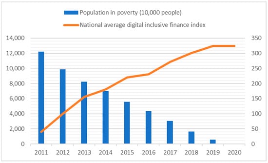 The population in poverty and the national average digital inclusive finance index in China from 2011 to 2020. (Source: People’s Government of China, White Paper on China’s Practice of Human Poverty Reduction, https://www.gov.cn/zhengce/2021-04/06/content_5597952.htm (accessed on 1 May 2022); The Peking University Digital Financial Inclusion Index of China from 2011 to 2020, https://idf.pku.edu.cn/yjcg/zsbg/513800.htm (accessed on 1 May 2022)).