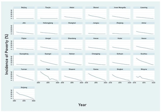- Incidence of poverty (IP)This paper uses the incidence of poverty to measure the degree of poverty. The data on the incidence of poverty comes from the 2011–2020 China Rural Poverty Monitoring Report.
