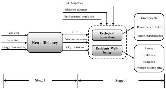 According to previous research [15,21], the efficiency evaluation of EE, EI, and RW in this paper was divided into two stages. The first stage was for EE, and the second stage was for EI and RW. Labor force, land, and energy were inputted in the first stage, and desirable outputs of GDP and undesirable outputs of pollution and CO2 emissions were obtained. In the two-stage network super-SBM model, the output of the first stage is part of the input of the second stage, which also includes external inputs such as research and development (R&D), education expenses and environmental regulation. Finally, we obtained three types of outputs representing EI, namely, high technology, green patents, and Internet popularization [33]. Four types of outputs represent RW, namely, disposable income, health care, education, and average housing price (undesirable output) [34]. The specific meaning of each indicator is explained below. The two-stage process is shown in Figure 1.