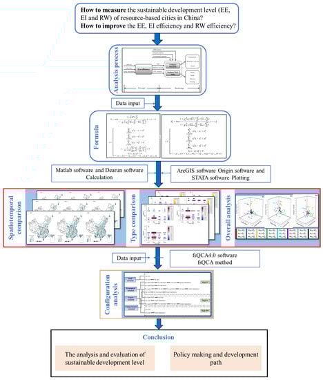 Countries around the world regard increasing gross domestic production (GDP) as the primary task of social development. The growth of GDP signifies a dynamic environment for innovation and a high standard of living, and then populations generate GDP by consuming resources, labor force, and other items. However, production activities will generate solid waste, wastewater, and greenhouse gas emissions, which inevitably lead to environmental pollution [15]. Therefore, in the context of sustainable development, it is both important and relevant to research the balance between regional economic development and environmental protection. Ecological efficiency (EE) was proposed by Schaltegger et al. in 1990 [16]. The metric of EE takes into account both natural resources and economic levels, along with their impact on the ecological environment. It is commonly employed to assess the sustainability performance of specific industries, regions, and other levels [17]. EE is an imperative indicator for assessing the sustainable development of society, directly related to economic resource consumption and environmental pollution [18]. Furthermore, the EE offers significant potential for investigation into the realm of regional sustainability. It embodies the capacity to yield more favorable outcomes, such as increased GDP, while concurrently minimizing resource consumption and mitigating ecological harm at a regional level. At the same time, the inputs of resources, labor force, etc. must be effectively translated into enhanced levels of ecological innovation (EI) and residents’ well-being (RW). EI plays a crucial role in bridging environmental concerns and economic development. Specifically, EI fosters societal progress by generating new manufacturing techniques and creating novel services [19]. This process is environmentally clean, resulting in fewer emissions of pollutants. Lastly, RW is intricately tied to both the ecological environment and social development, encompassing various aspects such as health, education, and the economy [14,15]. Enhancing EE holds significant importance in fostering both EI within society and the improvement of RW. The goal of improving regional EE is to promote EI and RW [20], and the main concern is to assess the levels of EI and RW in a region that are affected by both desired and undesired outputs [21]. Therefore, determining how to achieve sustained improvements in EE, EI, and RW levels with fewer ecological impacts on the available resources is essential for achieving sustainable development. Currently, studies on the efficiency and pathways of sustainable development of resource-based cities in China can be broadly divided into two categories. One category is to calculate the EE and EI efficiency of resource-based cities in China, followed by efficiency evaluation and/or comparison among regions, etc. [13,22,23,24]. The other category explores methods of achieving sustainable development in resource-based cities using the results of EE calculations [25,26,27]. The above research results are inspiring for the study of sustainable development of resource-based cities in China, but there are still some shortcomings. Firstly, the chosen research indicators appear overly broad and conservative in the present research. This results in numerous studies displaying substantial research depth while simultaneously lacking breadth. Therefore, it is feasible and reasonable to evaluate the level of sustainable development in three dimensions: EE, EI, and RW. In addition, few studies have explored the time-dynamic process of efficiency and have not revealed the history of efficiency changes over the years since the sustainable development of resource-based planning in China. Finally, the use of qualitative and quantitative methods based on the study of efficiency to explore the path of sustainable development in resource-based cities in China has also received little attention from scholars.