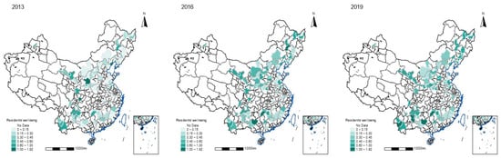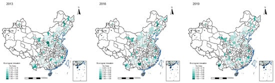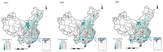 The sustainable development planning of resource-based cities in China took place from 2013 to 2019. In order to achieve a balanced distribution of the years and to meticulously observe the evolving trajectories of the EE, EI, and RW in these cities, we opted for the years 2013, 2016, and 2019 as the focal points for our study. The EE, EI, and RW of 92 sample resource-based cities in 2013, 2016, and 2019 were calculated based on the two-stage super-SBM method. The calculation results are shown in Appendix A, Table A2, Table A3 and Table A4. Next, the changes in the EE, EI, and RW for the years 2013, 2016, and 2019 are shown on the map (where 2013 is the start year of the planning policy, 2019 is the completion year, and 2016 is the intermediate year selected for this study), and the results are shown in Figure 3, Figure 4, Figure 5, Figure 6, Figure 7 and Figure 8.