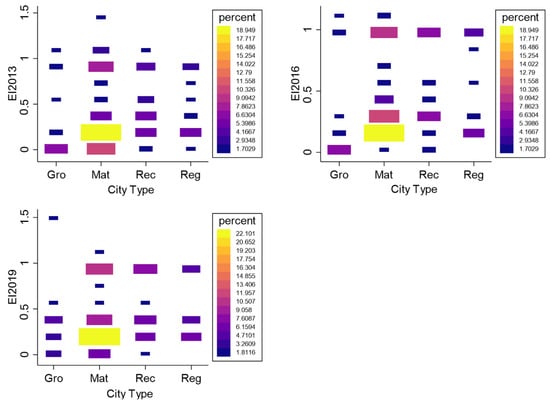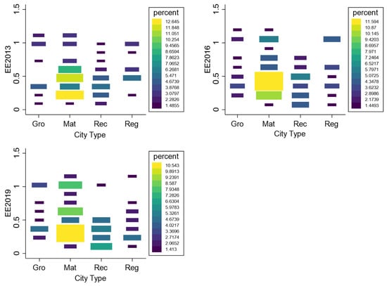 Figure 4 shows the performance of the EE of 92 sample resource-based cities of four development types in the years 2013, 2016, and 2019. Among them, the EE of growth resource-based cities shows an upward trend from 2013 to 2019, but the low values still occupy a large proportion. These cities are in the early stage of resource development and have better ecological conditions, and with the support of national policies, they have brilliant development prospects. The largest number of cities are maturity resource-based cities, and the EE of these cities also had an upward trend during 2013–2019. Low values of EE are common in these cities; cities with high values of EE are in the early and middle stages of the maturity period, and the sustainable development strength of cities is located near the peak. Cities with low values of EE have mostly experienced the peak of the maturity period and have started to develop towards the recession type. The EE of resource-based cities experiencing economic recession exhibits a clear and consistent decline. Despite these cities’ prolonged efforts toward industrial transformation and advancement, the findings of this study suggest that they have yet to make substantial headway in enhancing their EE development. In addition, the development potential of regeneration resource-based cities is insufficient, which can be attributed to the deep-rooted traditional development model and the failure of industrial transformation and upgrading. Therefore, the re-planning of recession and regeneration resource-based cities is a key issue for the Chinese government to consider today.