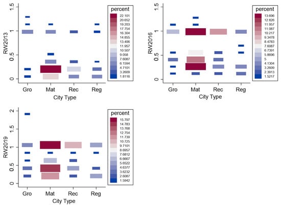 Heat map of RW in 2013, 2016, and 2019 (Gro = growth; Mat = maturity; Rec = recession; Reg = regeneration).