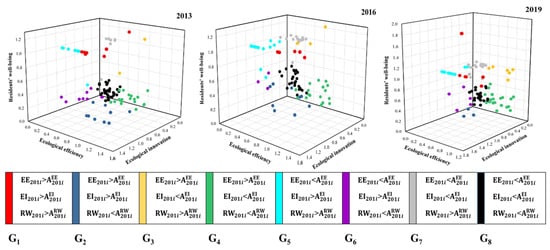 As shown in Figure 9, the 92 sample resource-based cities were categorized into eight groups based on the average values of EE, EI efficiency, and RW efficiency in 2013, 2016 and 2019 (A indicates the average value): those with values higher than the average value for all indicators (G1), those with values higher than the average value for two indicators (G2, G3, and G5), those with values lower than the average value for one indicator (G4, G6, and G7), and those with values lower than the average value for all indicators (G8). The results in Figure 9 indicate that the number of cities with greater than or equal to two indicators shows a trend of increasing and then decreasing over the three stages (28.3%, 34.8%, and 31.5% of all cities, respectively), and the proportion of cities with less than or equal to two indicators has been large over the three years, indicating that most resource-based cities in China are underperforming in EE, EI, and RW; thus, it is urgent to achieve high-quality and sustainable development. Furthermore, there are only three cities in G1 (Nanchong, Zigong, and Suqian) that have values higher than the global average value for all three indicators and three phases. These three cities are considered pioneering countries in promoting their EE, EI, and RW performance. On the contrary, there are five cities, Chifeng, Tonghua, Yizhou, Pingxiang, Zhangjiakou, and Chengde, in G8, which have values higher than the average value for all three indicators and three phases. These cities should focus on finding the right development path to change the status quo. In addition to the cities that did well and the worst, we also found Xuancheng and Hechi, the two cities that made the most progress in the three indicators among the 92 sample cities, and their successful experiences and development paths are worthy of reference for those resource-based cities in trouble. The three cities of Baotou, Yan’an, and Daqing, on the other hand, have experienced a significant decline in the values of the three indicators over the past few years, and this phenomenon deserves sufficient attention from the local governments to change their development mindset and get out of the development dilemma.
