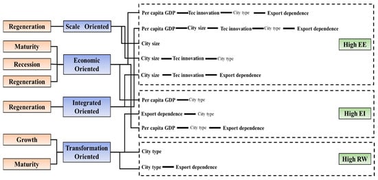 The case function of fsQCA4.0 was used to identify specific cities with high EE, high EI efficiency, and high RW efficiency, and then these cities were clustered according to city type, and the most suitable development orientation and development path for each type of city was summarized, as shown in Figure 10. Among them, growth resource-based cities are suitable for transformation-oriented development paths, which require these resource-based cities to lay a good foundation for development, focus on the rapid development of urban economy and industries, etc., to transition to the next stage. Maturity resource-based cities are suitable for economic-oriented and transformation-oriented paths. Specifically, resource-based cities in the initial stages of maturity can effectively fortify their position by aligning with an economic orientation. On the other hand, mature resource-based cities at a later stage of development must strategically navigate swift and high-quality transformation. In addition, they should be cautious about the potential pitfalls of succumbing to the “resource curse” phenomenon. Recession resource-based cities are suitable for economic-oriented development paths, and they need sufficient funds to fill the gap in urban development. In the absence of the new industry configuration, economic development is always the priority, and it is a better way to find the possibility of transformation in economic development. Finally, for regeneration resource-based cities, scale-oriented, economic-oriented, and integrated-oriented are all appropriate paths. The number of regenerative resource-based cities in China is still relatively small now, but will gradually increase in the future. Therefore, it is an important responsibility for regeneration resource-based cities to continuously explore suitable development paths according to their actual conditions. As pioneers, the development orientations and paths of these regeneration resource-based cities represent the future of resource-based cities in China to a large extent.