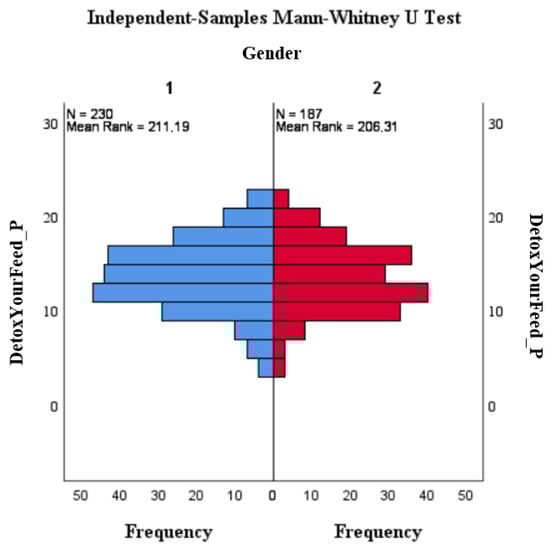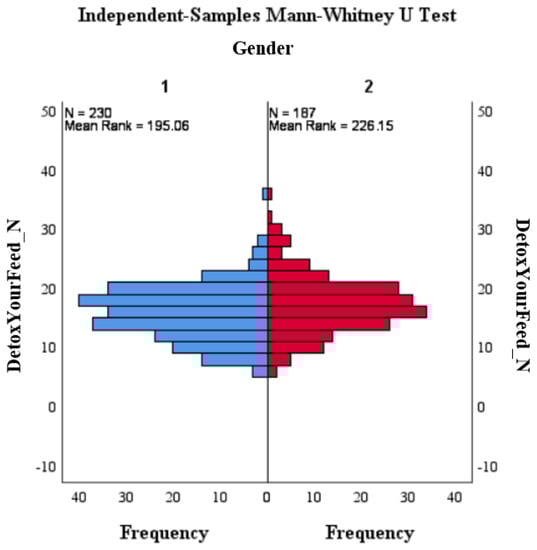 Figure 1 displays the frequency distribution of positive moods, with women represented in blue and men in red. The sum of positive emotions reached 12 for both men and women. Figure 2 shows the frequency distribution of negative moods, with women having a frequency of 19 and men having a frequency of 18. This indicates stronger negative emotions while watching the #DetoxYourFeed commercial. The results shown in Figure 1 and Figure 2 support the results of the Mann–Whitney U-test, which demonstrated a correlation between gender and the occurrence of negative emotions.