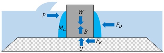 where and denote the weight of a caisson, the added mass, the gravity, and the horizontal acceleration of the caisson. is equal to , where is the water depth to the bottom of the breakwater and is the seawater density [21]. The initial conditions to solve the equation are . In addition, are the horizontal wave load, the friction force at the bottom interface, and the damping force exerted by seawater–structure interactions. The friction can be expressed by: