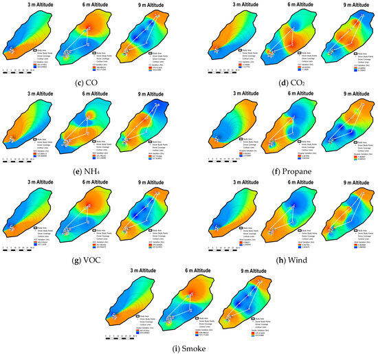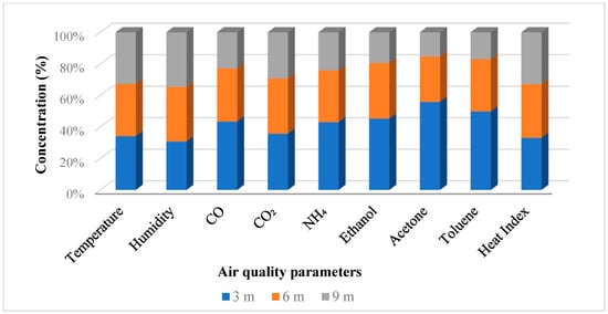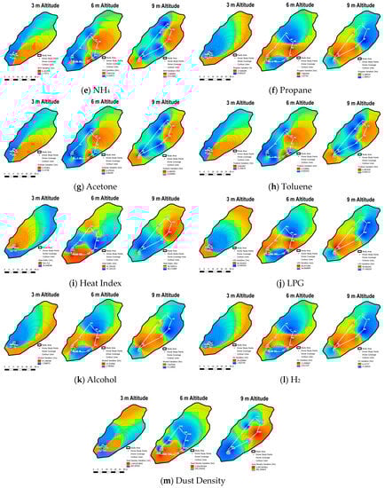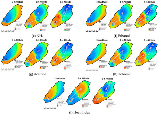 The heat index, a measure of the human-perceived temperature, reached its highest level of 56.9 °C at a height of 3 m (Figure 8i). The increase in the heat index can be attributed to the presence of pollutants like ethanol, acetone, and toluene, which are often found in industrial areas. However, the overall air quality seemed to improve with increasing height as the concentration of CO and NH4 decreased at higher altitudes. Overall, the data suggest that air pollution levels decrease with altitude, with the lowest levels observed at 9 m. Nonetheless, the distinct patterns for individual pollutants differ, as illustrated in Figure 9, suggesting that various factors could impact their dispersion in the atmosphere. Notably, the information demonstrated in Table 4 was amassed through sensors mounted on drones, which encompassed a limited radius at 3 m above ground level and progressively broadened as the altitude heightened. The data collected from these sensors can help develop effective measures to control air pollution in urban areas. These results could be helpful for policymakers and environmental researchers to develop strategies to mitigate air pollution.