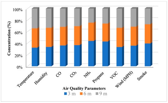 On the other hand, the parameter of heat index shows an increasing trend with height (Figure 6i). The maximum heat index, a gauge of the perceived temperature incorporating both humidity and actual temperature, is documented at 9 m. Similarly, the highest values of alcohol and H2 are recorded at 3 m (Figure 6k,l), while the highest dust density is recorded at 6 m (Figure 6m). This indicates that the concentration of this pollutant is higher at a moderate height from the ground. In summary, Figure 7 shows that air pollutant parameters vary significantly with altitude. These findings can facilitate comprehension of the dispersion of air pollutants in the atmosphere and support the development of productive strategies to curtail their levels.