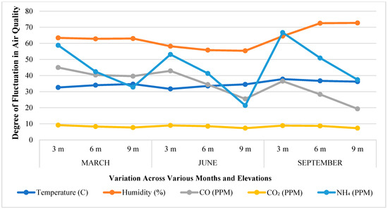 Within this segment, we showcase the outcomes of air pollutant monitoring at diverse elevations throughout March, June, and September. Table 5 compares the temperature, humidity, CO, CO2, and NH4 values at different altitudes (3 m, 6 m, and 9 m) during three selected months (March, June, and September). Overall, the data have some similarities and differences across the three months and three altitudes.