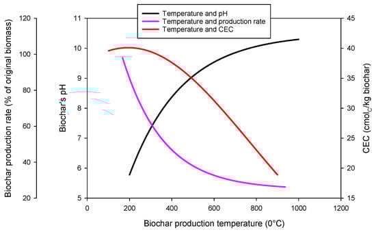 Biochar is a pyrogenic carbon-rich material that carries diverse properties. The pyrolysis temperature, residence period, chosen feedstock, and thermal conversion technology affect the properties of biochar [28]. Among the driving factors, pyrolysis temperature possibly has significant impacts on the characteristics of biochar (Figure 2). According to a study that synthesized the relationships between biochar production parameters and biochar properties, the CEC and volatile matter were negatively associated with the increasing pyrolysis temperature, suggesting that biochar produced at higher temperatures would have less CEC and volatile carbon. This decrease in CEC is linked to the formation of basic functional groups and a decrease in the quantity of acidic functional groups, particularly carboxylic functional groups at higher temperatures [29]. High-temperature (600–700 °C) biochars have well-organized aromatic carbon layers, and thus have low H:C and C:O ratios. However, the pH, specific surface area, ash and carbon content, and pore volume was positively associated with the increasing pyrolysis temperature [30]. Since biochar produced at higher temperatures carries a larger amount of ash, this leads to a higher biochar pH, and thus carries greater liming properties, while biochar produced at relatively lower temperatures carries higher carboxylic and phenolic functional groups that contribute to pH buffering during deprotonation [30]. The production of biochar is also influenced by factors other than pyrolysis temperature, including moisture content, lignin, and cellulose content in the biomass [31]. For example, biochar produced from solid waste and animal litter carries lower aromatic carbon and higher ash than biochar made from agricultural residue and wood biomass [30]. To generalize the biochar’s contribution to soil acidity amelioration, there are three biochar-mediated mechanisms. These are (a) its liming values, (b) its buffering capacity of soil pH and (c) its role in changing soil functions such as nutrient uptake and water uptake. These are discussed below.