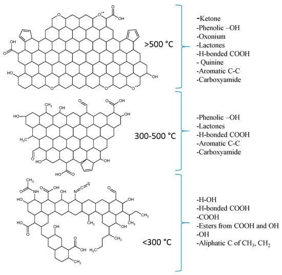 Possible functional groups on the biochar surface at different pyrolysis temperatures.