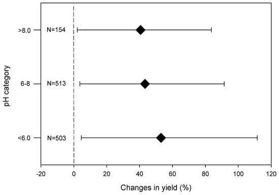 On average, biochar enhanced crop performance, with the largest increase observed in acidic soils. Several meta-analyses showed that crop performance is the most pronounced in acidic soils (Figure 5). The average yield increase was 53% in acidic soils (pH < 6.0) [59]. Application of biochar with inorganic fertilizers was shown to have a more pronounced effect than biochar alone [57]. Nevertheless, the yield advantage depends on both soil and biochar properties.