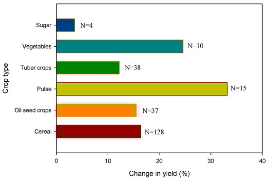 Xu et al. [60] reviewed updated datasets from globally conducted 455, 131, and 95 independent experiments to identify the key factors influencing the responses of crop yield, soil organic carbon, and global warming potential to biochar (B) and biochar combined with chemical fertilizers (BF). The study’s goal was to investigate the variation in the effect of biochar application alone (B) and biochar combined with chemical fertilizers (BF) on crop yield, soil organic carbon (SOC), and global warming potential (GWP). Overall biochar and biochar combined with chemical fertilizer increased crop yield by 15.1% and 48.4%,respectively.