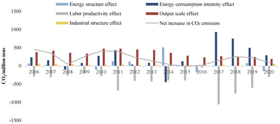 3.3. Factor Decomposition of Urban Energy-Related CO2 Emissions in China’s Coastal Region
