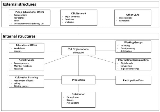 One property that all CSAs have in common is the high degree of transparency in their structure. It is one of the key characteristics of CSAs and can be seen through the entire organizational framework. The farms are organized in a way that allows a high degree of interaction, supports exchange and creates an environment in which knowledge creation can flourish. Figure 1 summarizes all internal and external structures embedded in the CSA system which are highly influential for the creation and dissemination of knowledge. These structures will be analyzed in the following sub-chapters.
