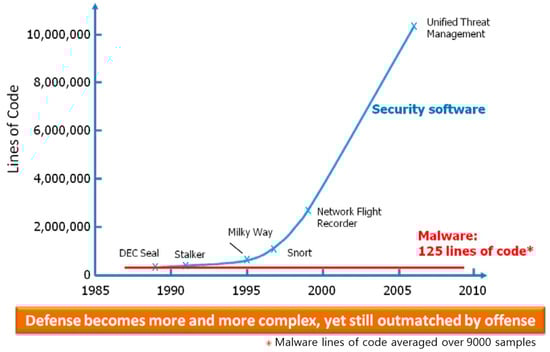 A disparity in the evolution of defensive and offensive software has been highlighted by DARPA, as depicted in Figure 1. Due to the amplifying intricacy of the systems under safeguard, the complexity of software safeguarding a network has been observed to surge exponentially. However, the size of software code employed in a successful assault has remained relatively unchanged []. A defense system is mandated to counteract every conceivable attack, while attackers need only channel their efforts at the defense’s most vulnerable point.