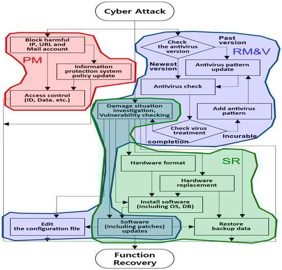 In the event of a successful malicious cyberattack, policy management (PM) updates, such as those related to information protection system policies, must be swiftly implemented to mitigate further damage and safeguard against subsequent attacks. The remove malware and vulnerabilities (RM&V) in preparation for secondary additional attacks. Subsequently, actions like system restoration (SR) are necessary to bring the compromised function back to its normal state [].