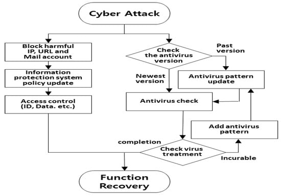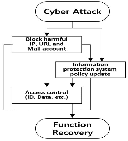 As depicted in Figure 5, the PM domain manages the security policies of the information protection system. This ensures the curtailment of damage spread and prevention of identical cyberattacks. To achieve this, malicious IPs/URLs and email accounts are blocked using firewalls and antihacking email measures. Detection policies of the intrusion prevention system (IPS), web firewall, and antivirus systems are updated with the most recent data. This helps in scrutinizing network packets for known cyberattacks, obstructing webpage forgery based on signatures, identifying malicious software, and isolating pertinent files. By employing extranet access management and a secure OS, different privileges can be assigned based on accounts, and data access can be regulated.