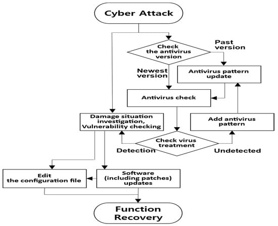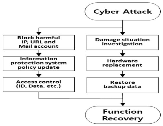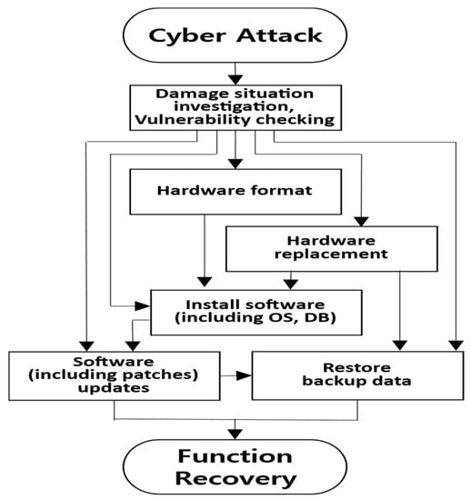 As illustrated in Figure 7, damage to cyber assets such as servers, storage, information protection systems, and networks is examined in the SR field to restore the hardware and software to their state prior to the cyberattack. For minor software errors, the latest version is installed. If the same error is encountered again, the relevant software is reinstalled (rebooting is required after deletion) and updated to the latest version. If a hardware issue arises, the related software is reinstalled after formatting, followed by a backup file restoration. However, for appliances (equipment designed to function immediately upon powering on without the need for installing a separate OS or software), the backup file is restored after hardware replacement.