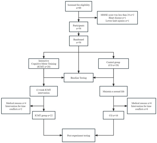 Participants were assigned to either the ICMT group or the control group using computer-based random sorting and grouping, with each participant being numbered and then randomly assigned to one of the two groups using SPSS (Statistical Package for Social Sciences, Inc., Chicago, IL, USA). After applying the inclusion criteria, 56 participants met the eligibility requirements and were enrolled in the study. All participants were randomized into an ICMT group (n = 28) and a control group (n = 28). After 12 weeks, for the ICMT group, four participants withdrew from the intervention for medical reasons (infected with COVID-19: n = 3, developed arthritis: n = 1); two participants withdrew from the intervention for time conflicts (did not complete the post-test: n = 1, did not attend more than 20% of training: n = 1). For the CG, six participants withdrew from the intervention for medical reasons (infected with COVID-19: n = 4, lower limb injury: n = 2); six participants withdrew from the intervention for time conflicts (did not complete the post-test: n = 6). Leaving a total of 38 participants (ICMT group = 22, control group = 16). This study received ethical approval from Shaanxi Normal University (202116003), and signed informed consent was obtained from all participants. We collected information on participants’ age, sex, education level, smoking status, and alcohol consumption. We also measured each participant’s light physical activity (LPA) and moderate-to-vigorous physical activity (MVPA) using an accelerometer-based activity monitor (ActiGraph WGT3X-BT, Pensacola, FL, USA). Participants were asked to wear the accelerometer on their non-dominant wrist for seven consecutive days. These seven days were worn before the intervention to prevent participants’ prior physical activity from influencing the results, and we analyzed physical activity as a control variable [24]. This study selected the proportion of total wear time spent in MVPA (MVPA%) as a covariate. It is important to note that the study has both strengths and limitations. The strengths include a rigorous randomized controlled trial design, objective measures of physical activity and balance, and comprehensive inclusion and exclusion criteria. The integration of real-time heart rate monitoring and the systematic progression of game difficulty enhanced the study’s methodological robustness. However, there are limitations to consider. The relatively small sample size could potentially limit the generalizability of the findings. Additionally, attrition during the intervention period and the potential influence of participant dropout on outcomes should be acknowledged.