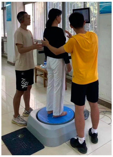 Previous studies have demonstrated that a commonly used duration for balance testing ranges from 10 to 30 s. In this study, a testing duration of 20 s was selected. During the preliminary experiments conducted before the actual study, it was observed that individuals exhibited varying degrees of fatigue recovery, generally ranging from 30 to 60 s. Therefore, a resting duration of 60 s was chosen [14,28,29]. During the test, participants stood with their feet shoulder-width apart and their waist and abdomen straight. The participant performed the test three times with eyes open and closed for 20 s each, with a recovery interval of 60 s to prevent fatigue between tests. The lower the value of each indicator collected, the more stable the participant is. This test was performed three times, and the average value of static balance ability was measured. In addition, we asked participants to wear the same shoes for the pre-test and post-test (Figure 4).