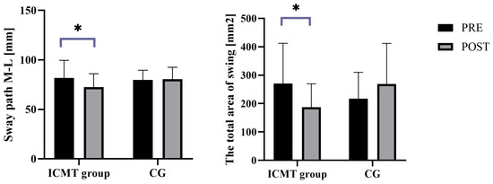 We found a significant improvement in the sway path in the M-L direction in the ICMT group in the eyes-open state and the total sway path in the eyes-closed state (p < 0.05, Figure 8).