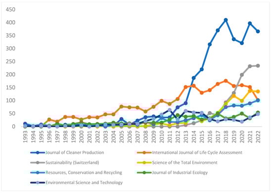 Documents per year by source (1993–2022). Search on Scopus database on keyword “Life Cycle Assessment” OR “Life-Cycle Assessments” Within Title OR Abstract and Author Keywords OR Indexed Keywords “Life Cycle Assessment” OR “Life-Cycle Assessments” OR “Life Cycle Inventory” OR “Life Cycle Impact Assessment (s)” OR “Comparative Life Cycle Assessment (s)” OR “LCA”.