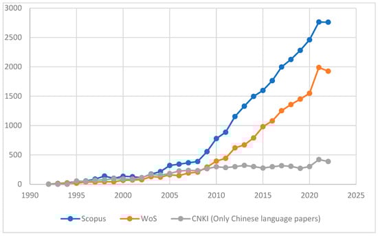 Evolution of LCA publications (1991–2022). Search on Scopus, WoS platform, and CNKI databases (only Chinese language papers) on keyword “Life Cycle Assessment” OR “Life-Cycle Assessments” Within Title OR Abstract and Author Keywords OR Indexed Keywords “Life Cycle Assessment” OR “Life-Cycle Assessments” OR “Life Cycle Inventory” OR “Life Cycle Impact Assessment (s)” OR “Comparative Life Cycle Assessment (s)” OR “LCA”.